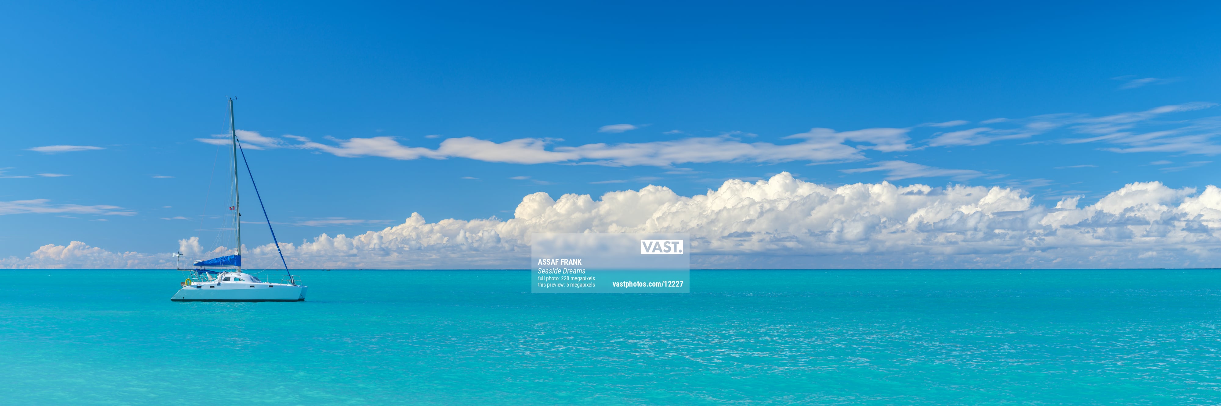 This panoramic photograph captures the stunning beauty of a tropical seascape, where vibrant turquoise waters stretch endlessly under a brilliant blue sky. Anchored peacefully on the serene ocean, a sleek sailboat with a blue canopy gently sways, embodying the essence of nautical leisure. The boat’s presence adds a charming focal point, inviting thoughts of relaxation and adventure.