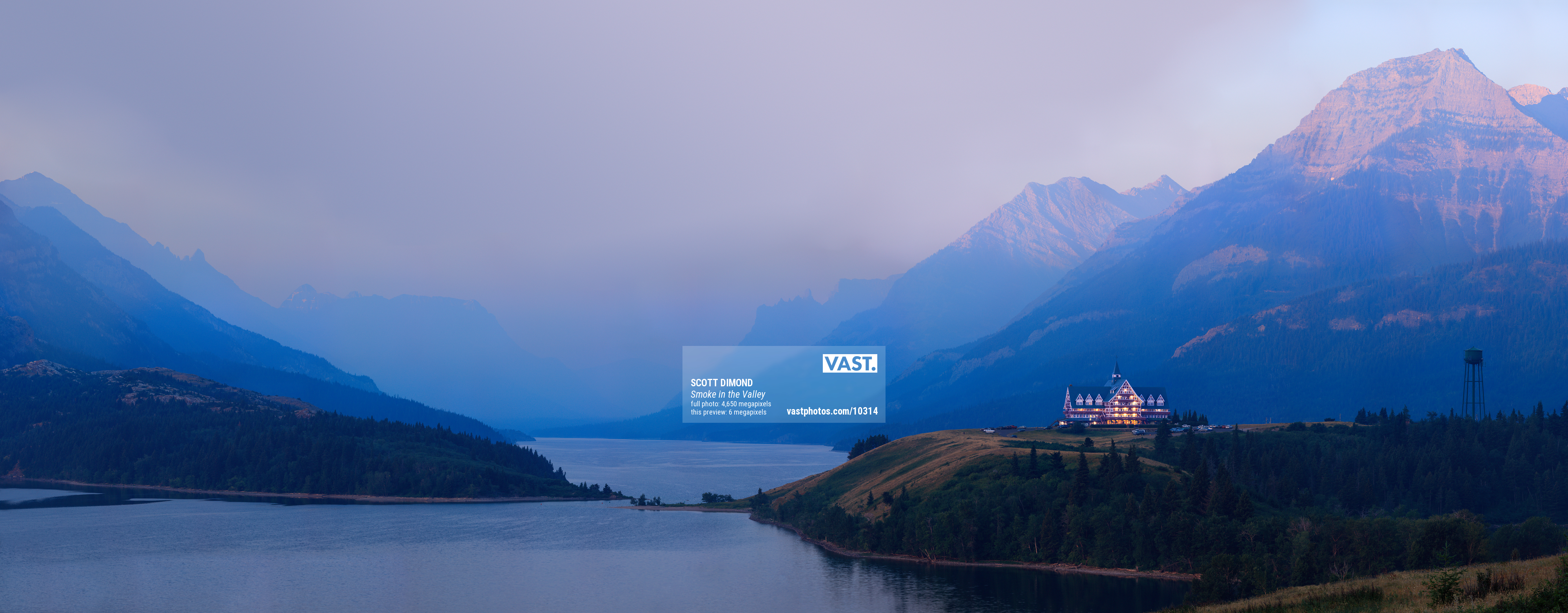 The next morning, I repeated the process and had much better luck with there being very little wind. The valley was full of smoke and it looked very promising. As I started shooting in the faint light before sunrise, my first subject was the iconic Prince of Wales Hotel while it still had its lights on. I knew that they would be off by the time I finished shooting hours later. I then captured images of the lake and foreground leaving the mountains and sky to the end, with the hope that some early morning sunlight from the east would provide some color. In the end, it all worked out well and I’m very happy with this exceptionally ultra-high-resolution photo.
