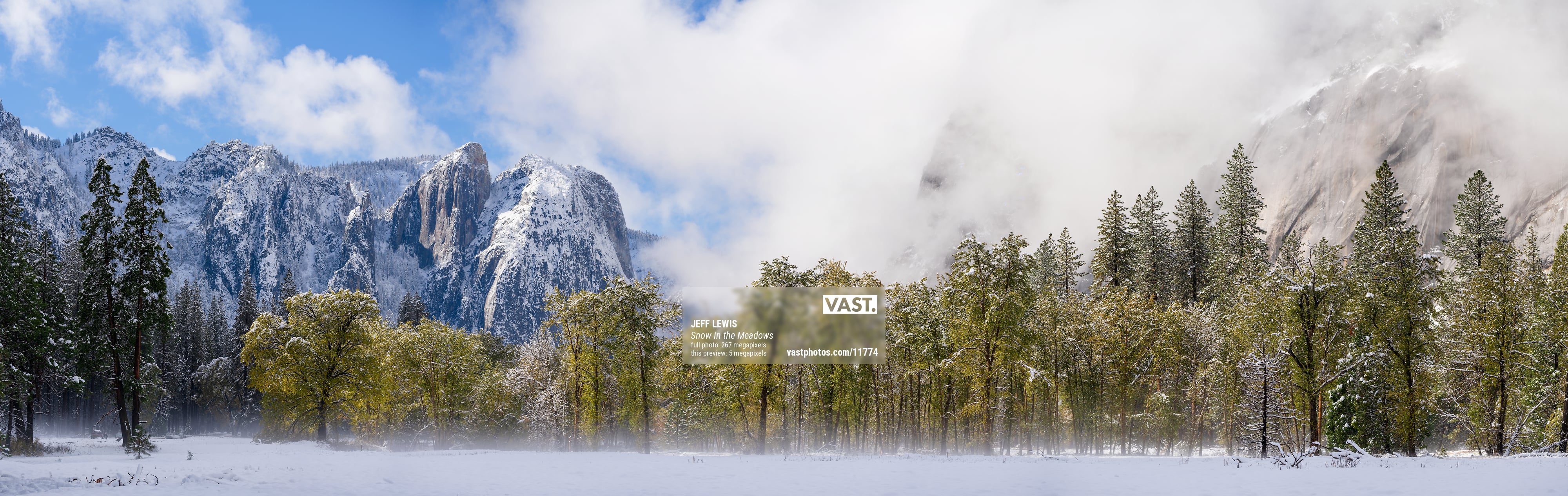 My favorite way to photograph these storms is to be there for the entire time, and to just stroll around aimlessly with my camera looking for magic moments and inspiration. I certainly found that here! This photo features the picturesque cliffs on both the north and south walls of the valley draped in ethereal fog, a snowy meadow with a thin layer of ephemeral mist, and of course some blue skies and sunshine. It's an easy scene to want to look at every day! Fortunately, now we can do just that :)