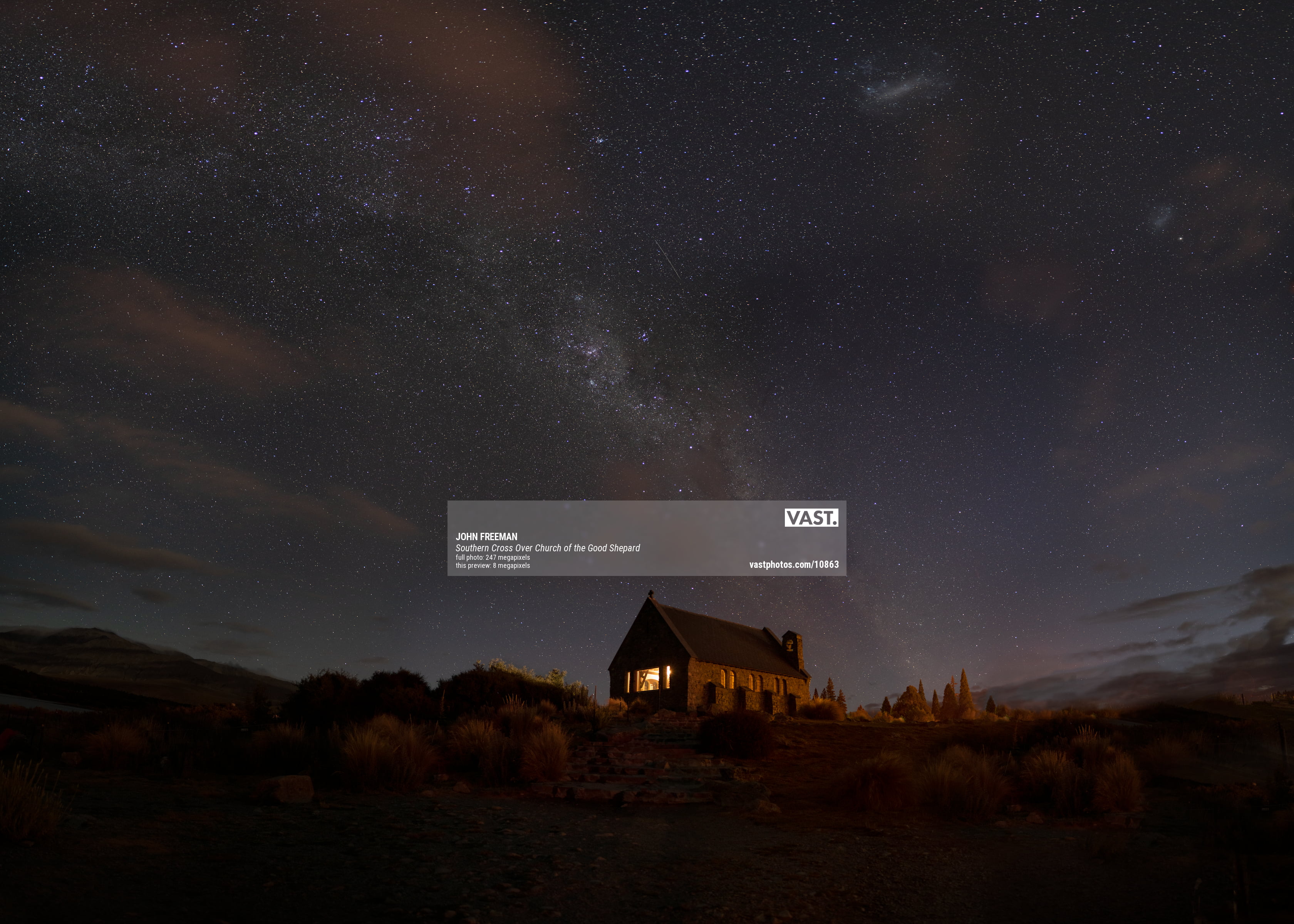 Visible directly above the church is the Southern Cross. The two cloud-like patches of light in upper right are the neighboring galaxies known as the Large Magellanic Cloud and the Small Magellanic Cloud and are only visible in the Southern Hemisphere skies. They are about 170,000 light years away and the Large Magellanic Cloud contains about 10,000 million stars. These are the closest galaxies to our own and are a stunning sight whether viewed with the naked eye, binoculars or a telescope. They are considered to be satellite galaxies linked by gravity to the Milky Way.