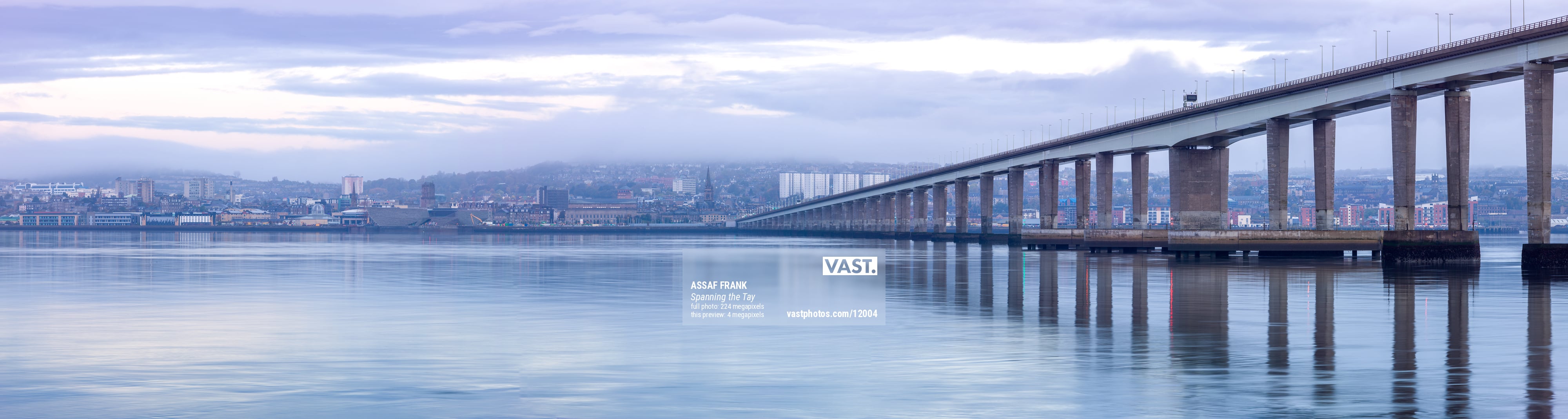 The Ray Road Bridge stretching across the calm waters of the River Tay in Dundee, Scotland. The long, elegant structure of the bridge is supported by towering concrete pillars, reflecting beautifully on the water’s surface. The misty sky and soft blue tones create a serene and atmospheric mood, enhancing the natural beauty of the Scottish landscape.
