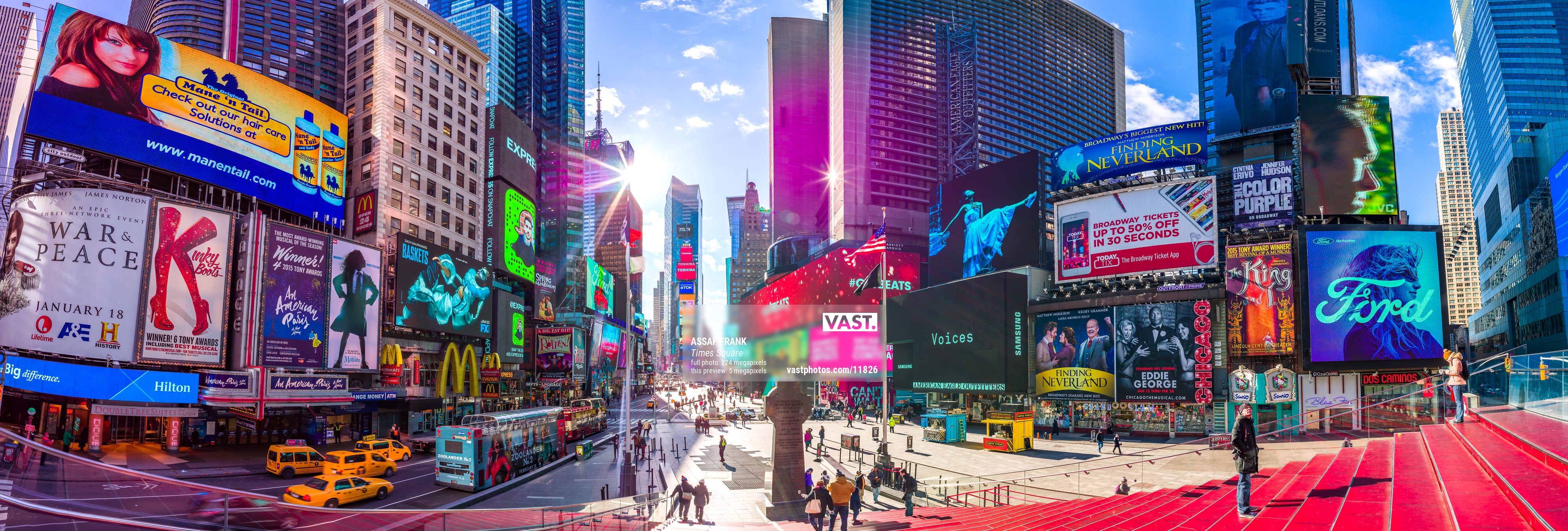 This vibrant panoramic photograph captures the essence of Times Square in New York City, one of the world's most iconic and bustling intersections. The image is alive with colour and energy, showcasing the myriad billboards, neon lights, and advertisements that define this urban hub. The towering buildings, adorned with dynamic signage, create a visually stimulating environment that captures the spirit of New York City.