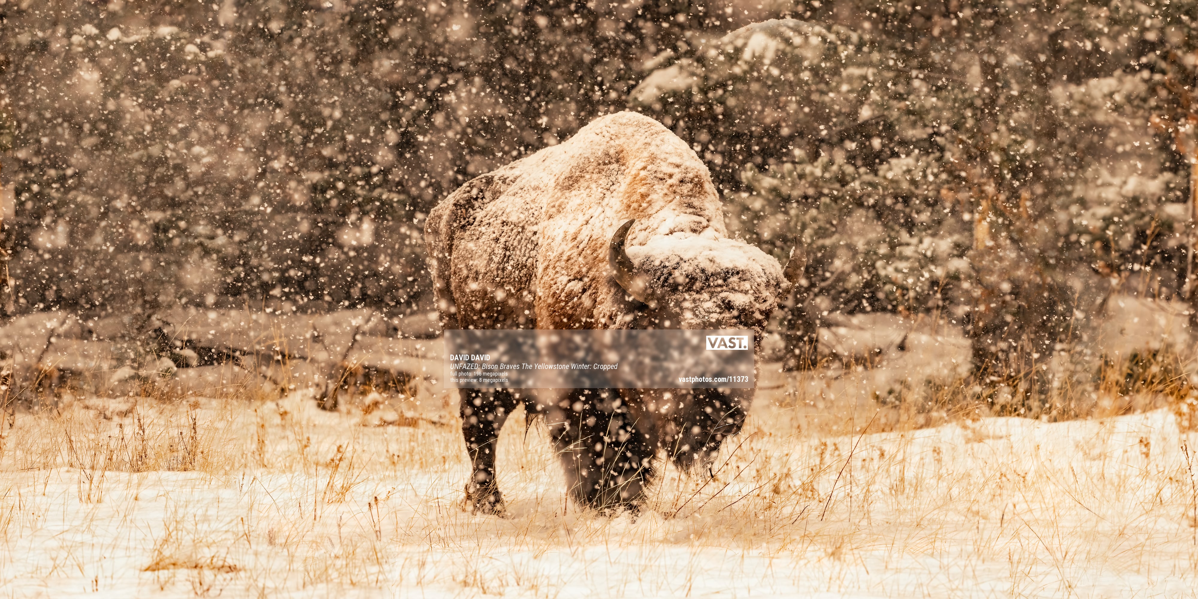 Months later when I got around to processing this image, I was at first disappointed with the results. It looked like the whole thing was a bust. The problem was, it appeared that not a single one of the hundreds of photos taken had the bison in focus. It was snowing so hard, and the flakes were so large, that the camera was continuously focusing on the falling snow. There are ways to avoid this, and I tried my best, but it appeared to have been in vain.