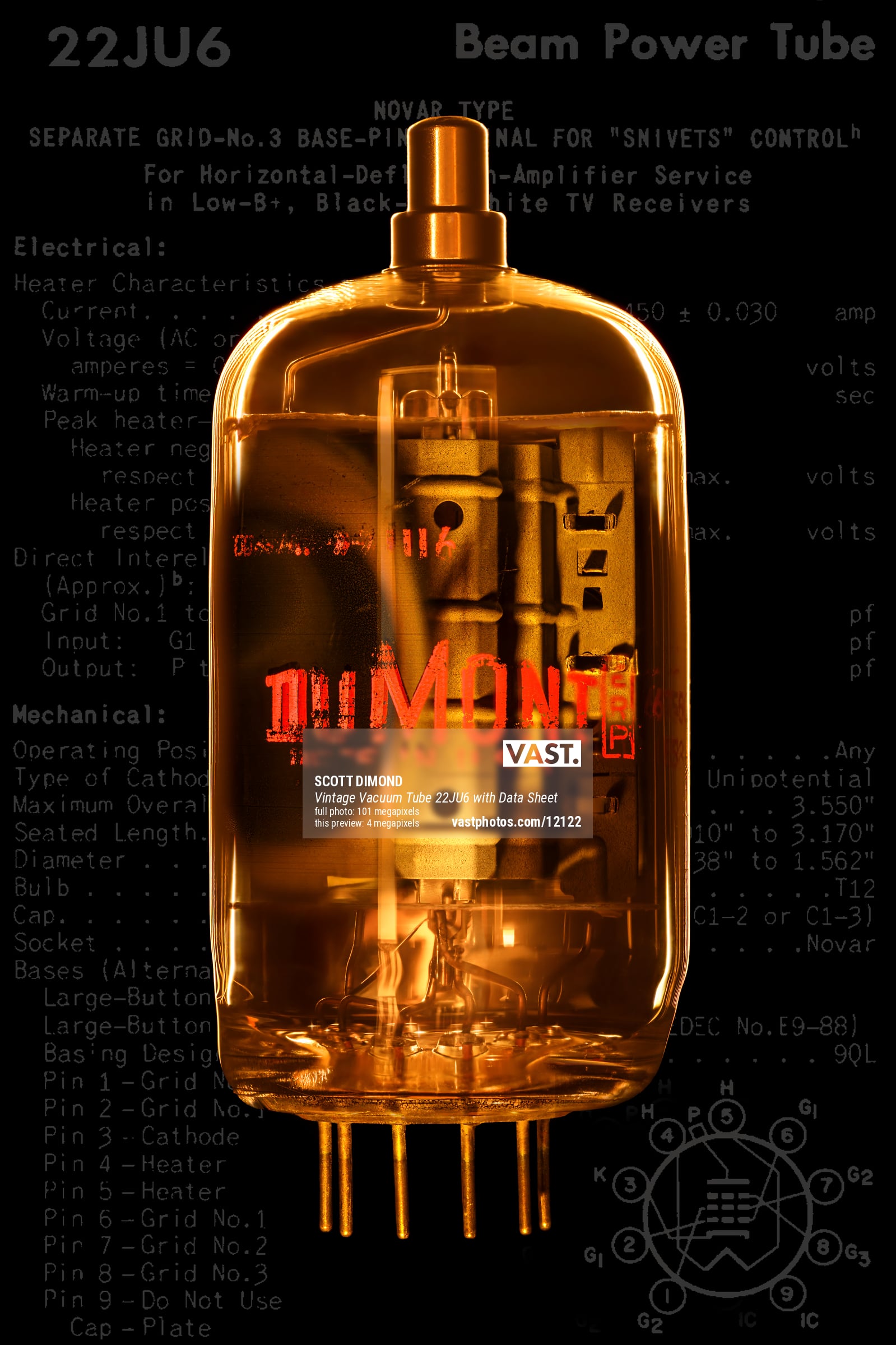 Photographer Scott Dimond had always thought that vintage vacuum tubes would make a great photographic subject, but he never pursued the idea until he came across a treasure trove of old tubes at a 2nd hand store. The result is an ongoing project showcasing vacuum tubes using various photographic techniques including backlighting, light painting and focus stacking. Where possible, Scott also energized the heating cathode within the tubes using a laboratory power supply. To determine which pins at the base of the tubes were used by the heating element, he needed to identify the tubes and then research them to find the manufacturer's original data sheets. Once found, those data sheets provided the information on the pin configuration and voltage/amperage that he needed to apply to activate the heating cathode.