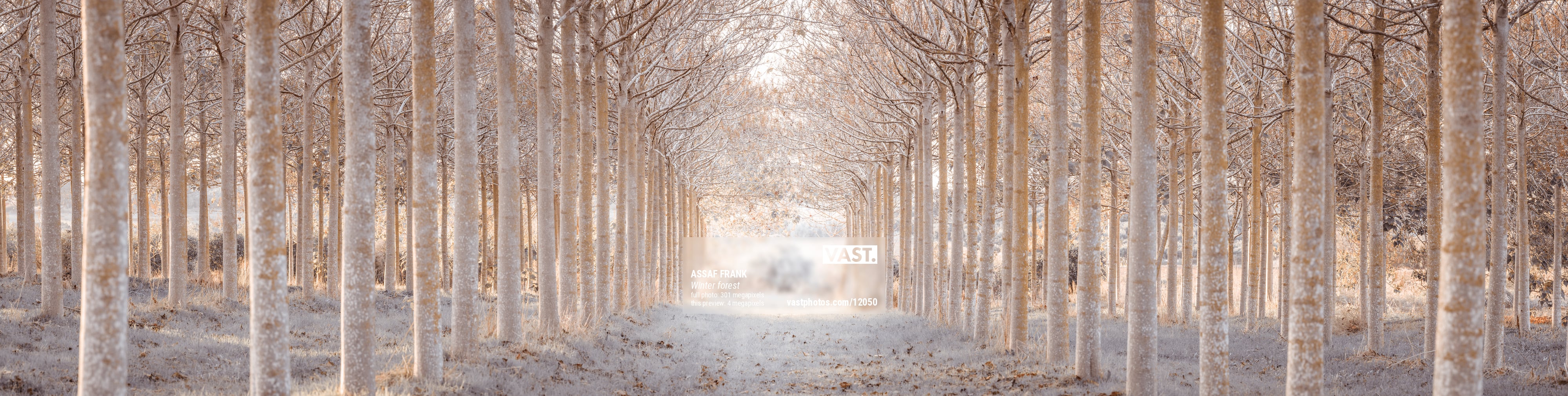 The depth of the scene is enhanced by the repetition of the tree trunks, creating a mesmerizing perspective that feels both vast and intimate. The pathway, gently blanketed in frost and scattered leaves, guides the viewer deeper into the composition, evoking a sense of curiosity and wonder. As the trees fade into the hazy light beyond, there is an ethereal quality to the landscape, as though it exists in a moment frozen in time.